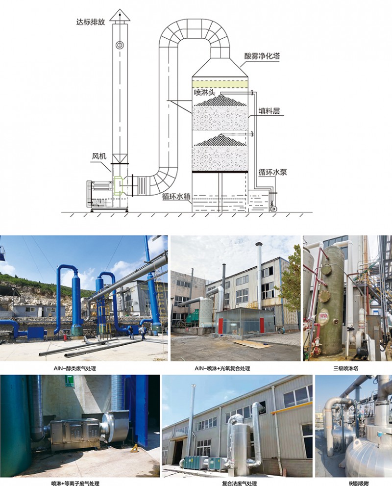 廢氣淨化噴淋塔主要的運作方式是廢氣由風管引入淨化塔,經過填料層,廢氣與氫氧化鈉吸收液進行氣液兩相充分接觸吸收中和反應,廢氣經過淨化後,再經除霧板脫水除霧後由風機排入大氣。吸收液在塔底經水泵增壓後在塔頂噴淋而下,回流至塔底循環使用。淨化後的廢氣達到地方排放標準的排放要求,低於國家排放標準。